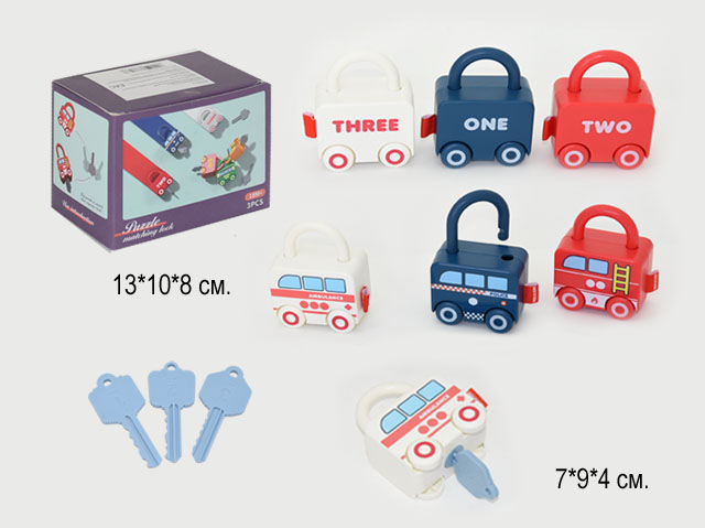 Обучающая игра головоломка "Машинки и ключики" понравится любому ребенку. В комплект входят 3 машинки и 3 ключика. У каждой машинки есть замочек и ключик, который подходит только к ней. Игра заключается в том, что ребёнку необходимо подобрать правильный ключик к каждой машинке. На каждой машинке с одной стороны нанесены точки, соответствующие цифре, а с другой — эта цифра написана на английском языке. На каждом ключике тоже есть цифры, таким образом, выучив их, малышу будет легче подобрать подходящий ключик. Головоломка развивает мелкую моторику, знание цвета, цифр и логическое мышление. У "машинок-замочков" крутятся колеса, и ими можно играть как обычными машинками. Игрушка предназначена для детей от 1,5 лет.