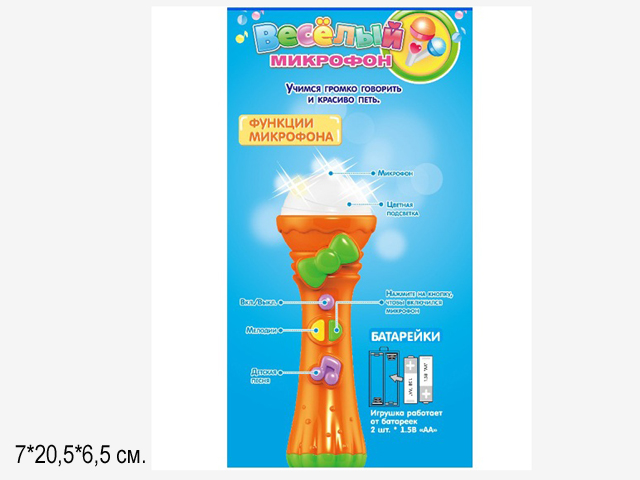 Рекомендуем для детей от 3-х лет.512.21 руб. 1 024.42 руб. - Микрофон арт. 7389" На бат. в кор. 20,6*7*6,5 /72шт.//бл.36/×Микрофон арт. 7389" На бат. в кор. 20,6*7*6,5 /72шт.//бл.36/Музыкальная игрушка, которая поможет усилить голос вашей маленькой звезды. Учитесь громко говорить и красиво петь.