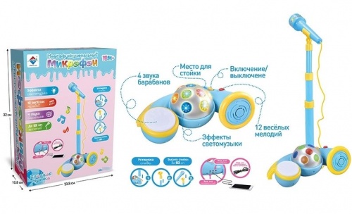 Для включения игрушки нажмите самую верхнюю кнопку на микрофоне. Средние кнопки: одна воспроизводит веселую песенку про алфавит, при нажатии второй кнопки включается микрофон и вы можете говорить в него и петь - Ваш голос будет звучать громко и четко.Самая нижняя кнопка на микрофоне в форме нотки воспроизводит разные мелодии.Все музыкальные фрагменты сопровождаются игрой разноцветных огоньков в верхней части микрофона. Форма микрофона сделана так, что малышу будет удобно держать его в руке и одновременно нажимать на кнопки.