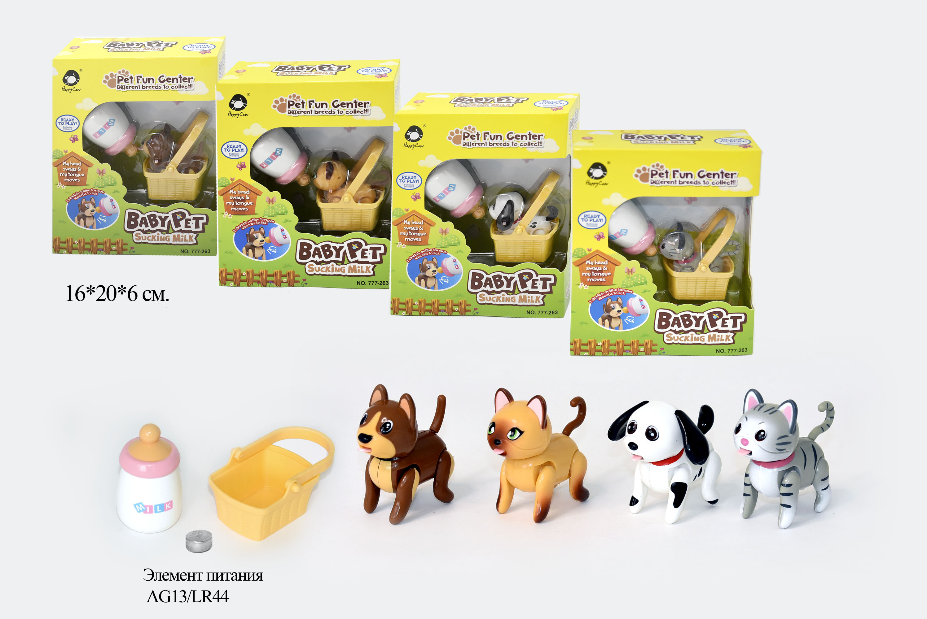 Размеры: 43 х 46 х 46 см237.03 руб. 474.05 руб. - Котенок арт. 777-263" На бат., лижет соску, в коробке 16 х 20 х 6 /48шт.//бл.24/×Котенок арт. 777-263" На бат., лижет соску, в коробке 16 х 20 х 6 /48шт.//бл.24/Питомец с бутылочкой - прекрасный набор для малыша. Он научит его заботиться о питомце. Игрушка не только оригинально оформлена, но еще и интерактивная. Он как настоящий высовывает свой язычок и лижет молочко. Игрушка учит пониманию причинно-следственной связи, помогает тренировать моторику и координацию движений, восприятие формы и цвета. Функционал: забавные звуки, ходит, «пьет» из бутылочки Размер изделия: питомец – 3х4х6 см, бутылочка – 4х4х7 см В набор входит: питомец, корзинка, бутылочка с молочком (имитация), батарейка. Возраст: от 5 лет Материал: пластик Производство: Китай Размер упаковки: 16 х 20 х 6 см297.21 руб. 594.41 руб.